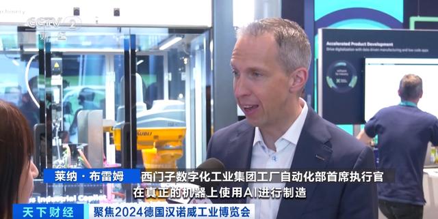 西门子数字化工业集团工厂自动化部首席执行官 莱纳·布雷姆:对我来说,这次展会真正的亮点是在真正的机器上使用AI进行制造。你可以问这台机器, 如何能更快地运行更高质量的机器。机器会回答你它认为可以优化的地方。在这种情况下,我们将确定它运转的时候存在哪些瓶颈,并确定当我们在提高生产力和质量时如何解决这些瓶颈。它应用于许多领域,包括所有机器制造,如汽车制造、电池行业、太阳能行业、轮胎行业的机器制造,以及食品和饮料领域。